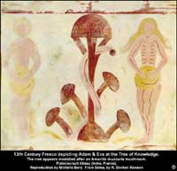 1291 AD: Fresco in Plaincourault Abbey in Indre, France depicts Adam and Eve standing beside a Tree of Knowledge which bears a striking resemblance to an Amanita muscaria mushroom. Art historians argue that this is a stylized tree having nothing to do with A. muscaria (see note) 1658 AD: Polish prisoner of war writes about a culture from western Siberia (Ob-Ugrian Ostyak of the Irtysh region) "They eat certain fungi in the shape of fly-agarics, and thus they become drunk worse than on vodka, and for them that's the very best banquet." - from Kamiensky Dluzyk "Diary of Muscovite Captivity published 1874 pg 382. 1 |