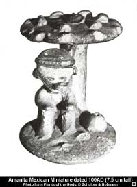 500-0 BCE: Rg Veda hymns, a set of sacred stories from India, include mentions of a magical intoxicant called Soma. In 1968, R. Gordon Wasson published the controversial book Soma: Divine Mushroom of Immortality, speculating that Soma refers to Amanita muscaria. 100 AD: 7.5 cm high miniature statue of an Amanita muscaria dated to 100 AD found in Nayarit, Mexico, suggests A. muscaria may have been in use in coastal Mexico. Many other sculptures from Central and South America depict the ritual use of other psychoactive plants and mushrooms. circa 0 - 1800 AD: Some Scandivian historians believe that Viking 'Bezerker Warriors' ingested Amanita muscaria before going into battle. Wasson writes "No one who discusses the fly agaric in Europe can ignore the debate that has been carried on for almost two centuries in Scandinavia on this issue. First Samuel Odman in 1784 and then Frederik Christian Schubeler in 1886 propounded the thesis that those Viking warriors knows as 'beserks' ate the fly-agaric before they 'went beserk'; in short, that 'beserk-raging' was deliberately caused by the ingestion of our spotted amanita." (Soma page 341) |